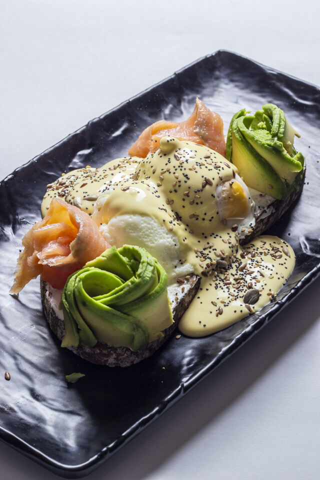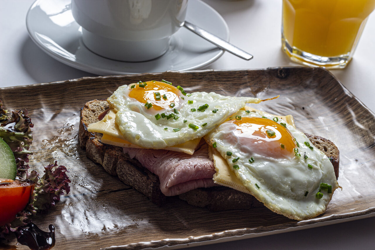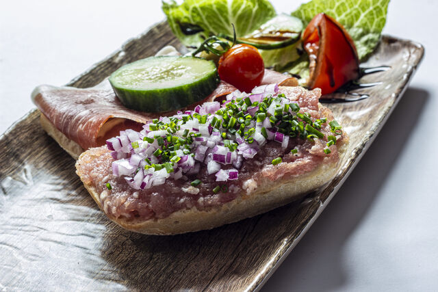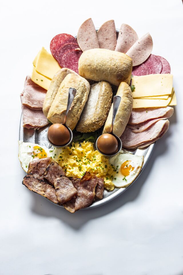 Comida típica y desayunos alemanes en asador con paredes de madera y ladrillo y terraza con vistas al mar.